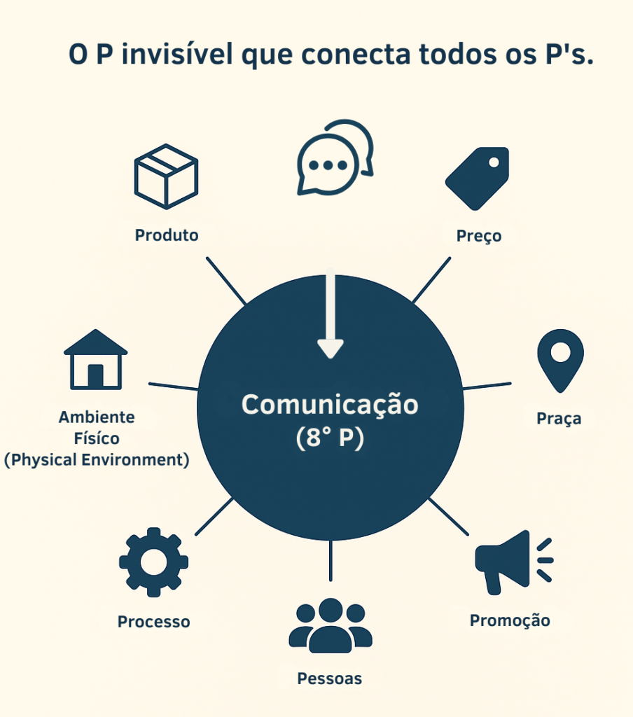 Ao reinterpretar os 7P’s sob o olhar da inovação, torna-se evidente a presença de um oitavo elemento, invisível, porém essencial: a Comunicação. Ela não é apenas uma etapa do processo, mas o tecido que conecta e dá sentido a todas as outras dimensões, do produto ao ambiente físico, das pessoas ao propósito.