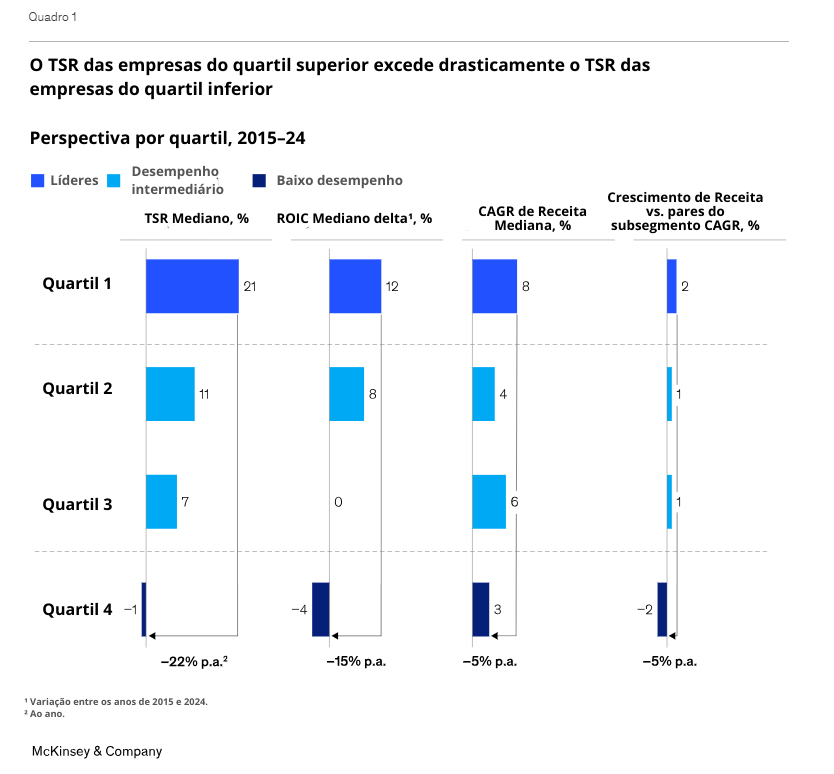 - Especialização e Ganhos de Escala: Um distribuidor de materiais de construção dos EUA multiplicou seu TSR por 11 ao se especializar em produtos e ganhar escala, inclusive via aquisição.