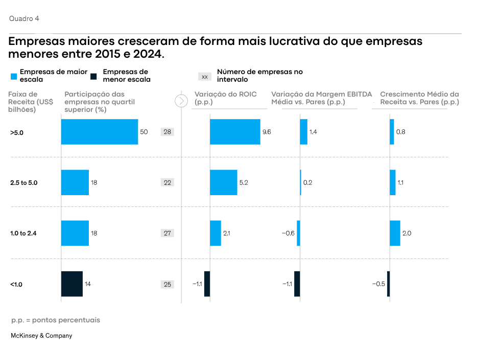 - Gigantes no Topo: Metade das empresas no quartil superior de desempenho, aquelas que geraram o maior TSR, são as maiores do setor, faturando mais de US$ 5 bilhões em receita anual. Empresas desse porte conseguem vantagens significativas (poder de compra, capacidade de investimento, eficiência operacional, entre outros).