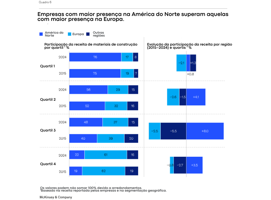 Um estudo da McKinsey & Company analisou 102 empresas de capital aberto na América do Norte e Europa, selecionadas por seu foco majoritário em materiais de construção. Essas empresas foram meticulosamente divididas em segmentos e subsegmentos com base em suas categorias de produtos (como materiais pesados, janelas e portas, ou isolamento). Esta segmentação foi crucial para a análise da McKinsey, revelando uma verdade fundamental: o sucesso não está tanto no segmento de mercado (seja cimento, vidro ou revestimento), mas sim na excelência da execução das estratégias e operações de uma empresa. Ou seja, a maneira como você gerencia o seu negócio é mais determinante do que o setor em si, independentemente da subcategoria específica de materiais que você produz ou vende.